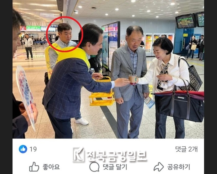 ![]() ▲ 당시 익산역에서 커피를 돌리는 조용식 후보 뒤에 있는 박 씨 모습이 담긴 SNS 사진. © |