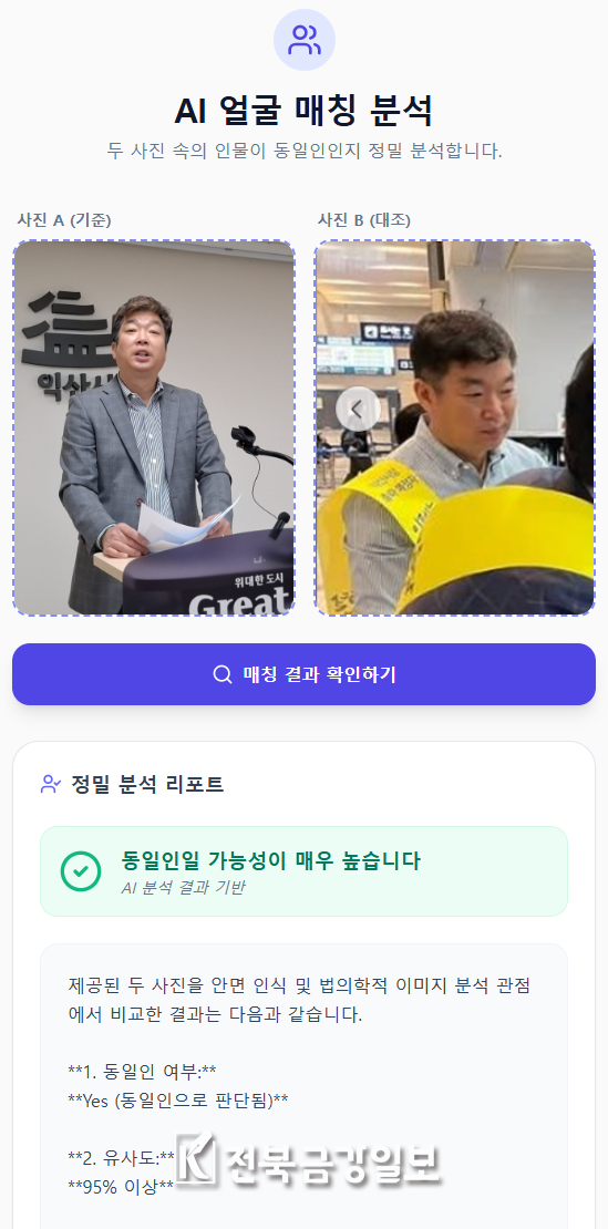 ![]() ▲ 박 씨와 관련해 익산역 사진과 기자회견 사진 비교해 AI얼굴매칭 결과 동일인 추정. © |