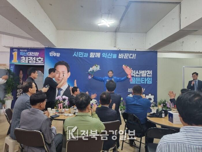 ![]() ▲ 더불어민주당 익산시장 후보로 선출된 최정호 후보가 선거사무소에서 지지자들 앞에 화답을 하고 있다. © |